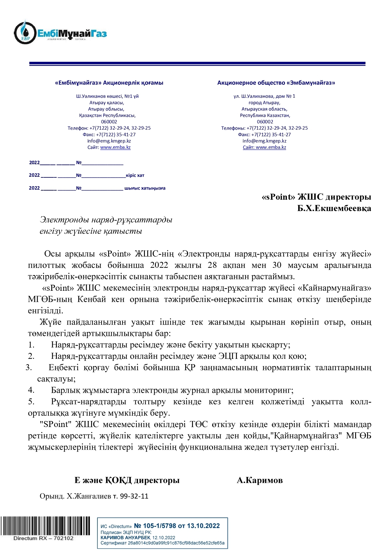 2023 жылдың 1 шілдесі «Ембімұнайгаз» АҚ-ның барлық МГӨБ-да жүйені енгізу туралы келісімге қол қойылды.